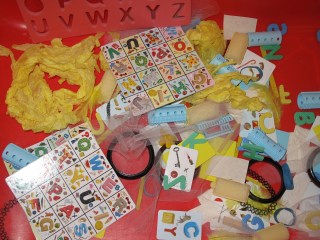 Water Table – plastic foods to wash in water table along with a variety of spoons, cups, strainers, scoops, etc.