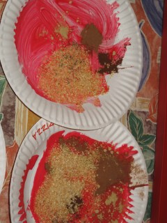 Art – Pizza Pies – children paint a paper plate with red colored glue and then sprinkle on a variety of herbs and spices. This was the first time we made these and the garlic salt made the whole room smell like a pizza shop! YUM!